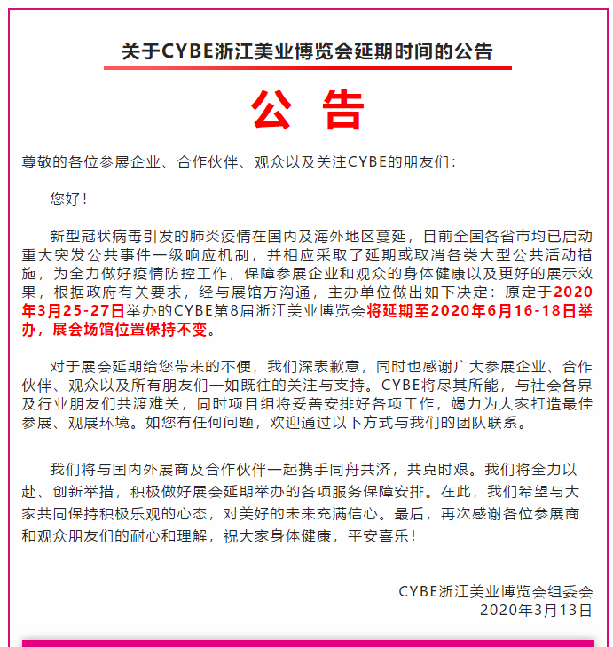 根據(jù)美博會設(shè)計(jì)搭建公司領(lǐng)藝展覽了解到,受疫情影響,原定于2020年3月25-27日舉辦的CYBE第8屆浙江美業(yè)博覽會將延期至2020年6月16-18日舉辦,展會場館位置保持不變。如需美博會設(shè)計(jì)請聯(lián)系領(lǐng)藝展覽,希望我們能在美博會搭建上為您添磚加瓦,祝各位朋友收獲多多,滿載而歸!