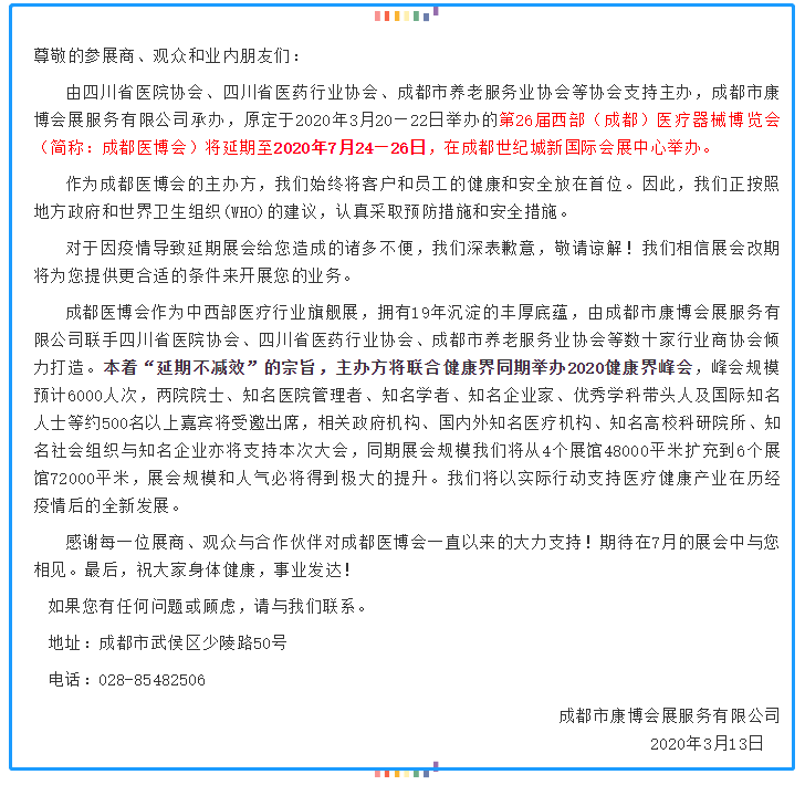 根據(jù)醫(yī)博會設(shè)計搭建公司領(lǐng)藝展覽了解到,原定于2020年3月20—22日舉辦的第26屆西部(成都)醫(yī)療器械博覽會(簡稱:成都醫(yī)博會)將延期至2020年7月24—26日,在成都世紀(jì)城新國際會展中心舉辦。如需醫(yī)博會展會設(shè)計請聯(lián)系領(lǐng)藝展覽,希望我們能在醫(yī)博會搭建上為您添磚加瓦,祝各位朋友收獲多多,滿載而歸!