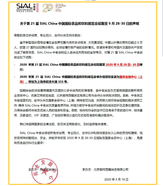 根據(jù)中食展設(shè)計(jì)搭建公司領(lǐng)藝展覽了解到,2020年SIAL China中國(guó)國(guó)際食品和飲料展覽會(huì)延期至9月28-30日舉行。如需中食展展會(huì)設(shè)計(jì)請(qǐng)聯(lián)系領(lǐng)藝展覽,希望我們能在中食展搭建上為您添磚加瓦,祝各位朋友收獲多多,滿(mǎn)載而歸!