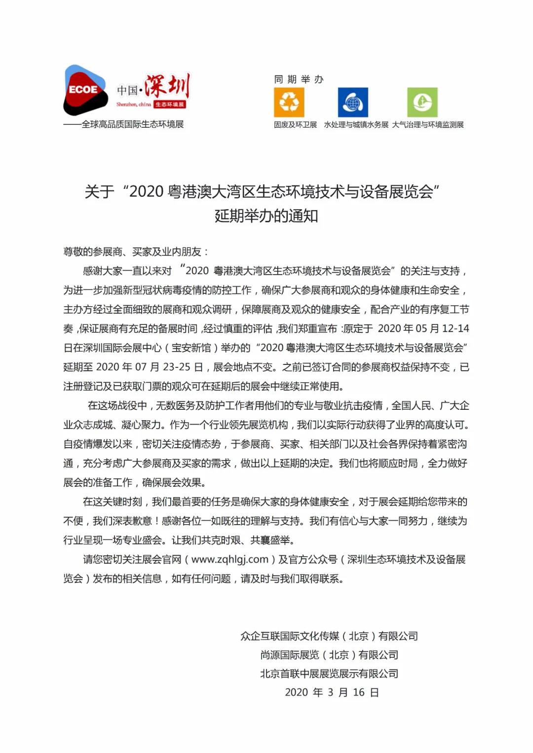 根據(jù)深圳展臺設(shè)計搭建公司領(lǐng)藝展覽了解到,原定于 2020年05月12-14日在深圳國際會展中心(寶安新館)舉辦的“2020粵港澳大灣區(qū)生態(tài)環(huán)境技術(shù)與設(shè)備展覽會”延期至2020年07月23-25日,展會地點不變。如需深圳展臺設(shè)計請聯(lián)系領(lǐng)藝展覽,希望我們能在深圳展臺搭建上為您添磚加瓦,祝各位朋友收獲多多,滿載而歸!