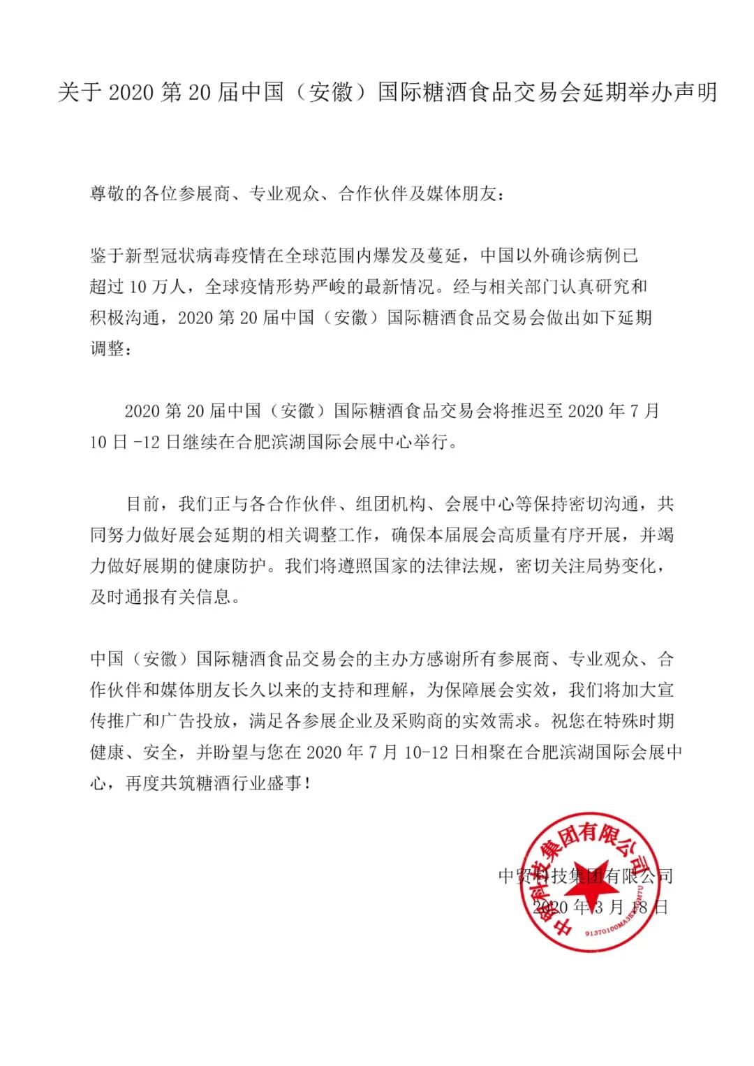 根據(jù)糖酒會設計搭建公司領藝展覽了解到,2020第20屆中國(安徽)國際糖酒食品交易會將延期舉辦。如需糖酒會展會設計請聯(lián)系領藝展覽,希望我們能在糖酒會搭建上為您添磚加瓦,祝各位朋友收獲多多,滿載而歸!