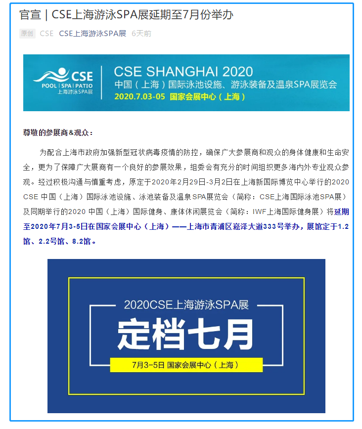根據(jù)上海展會設(shè)計搭建公司領(lǐng)藝展覽了解到,原定于2020年2月29日-3月2日在上海新國際博覽中心舉行的2020 CSE 中國(上海)國際泳池設(shè)施、泳池裝備及溫泉SPA展覽會(簡稱:CSE上海國際泳池SPA展)及同期舉行的2020 中國(上海)國際健身、康體休閑展覽會(簡稱:IWF上海國際健身展)將延期至2020年7月3-5日在國家會展中心(上海)——上海市青浦區(qū)崧澤大道333號舉辦,展館定于1.2館、2.2號館、8.2館。如需上海展會設(shè)計請聯(lián)系領(lǐng)藝展覽,希望我們能在上海展會搭建上為您添磚加瓦,祝各位朋友收獲多多,滿載而歸!