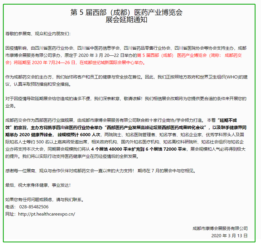 根據(jù)成都展臺搭建公司領藝展覽了解到,原定于 2020 年 3 月 20—22 日舉辦的第 5 屆西部(成都) 醫(yī)藥產(chǎn)業(yè)博覽會(簡稱: 成都藥交會)將延期至 2020 年 7月24—26 日,在成都世紀城新國際會展中心舉辦。如需成都展會設計請聯(lián)系領藝展覽,希望我們能在成都展會搭建上為您添磚加瓦,祝各位朋友收獲多多,滿載而歸!